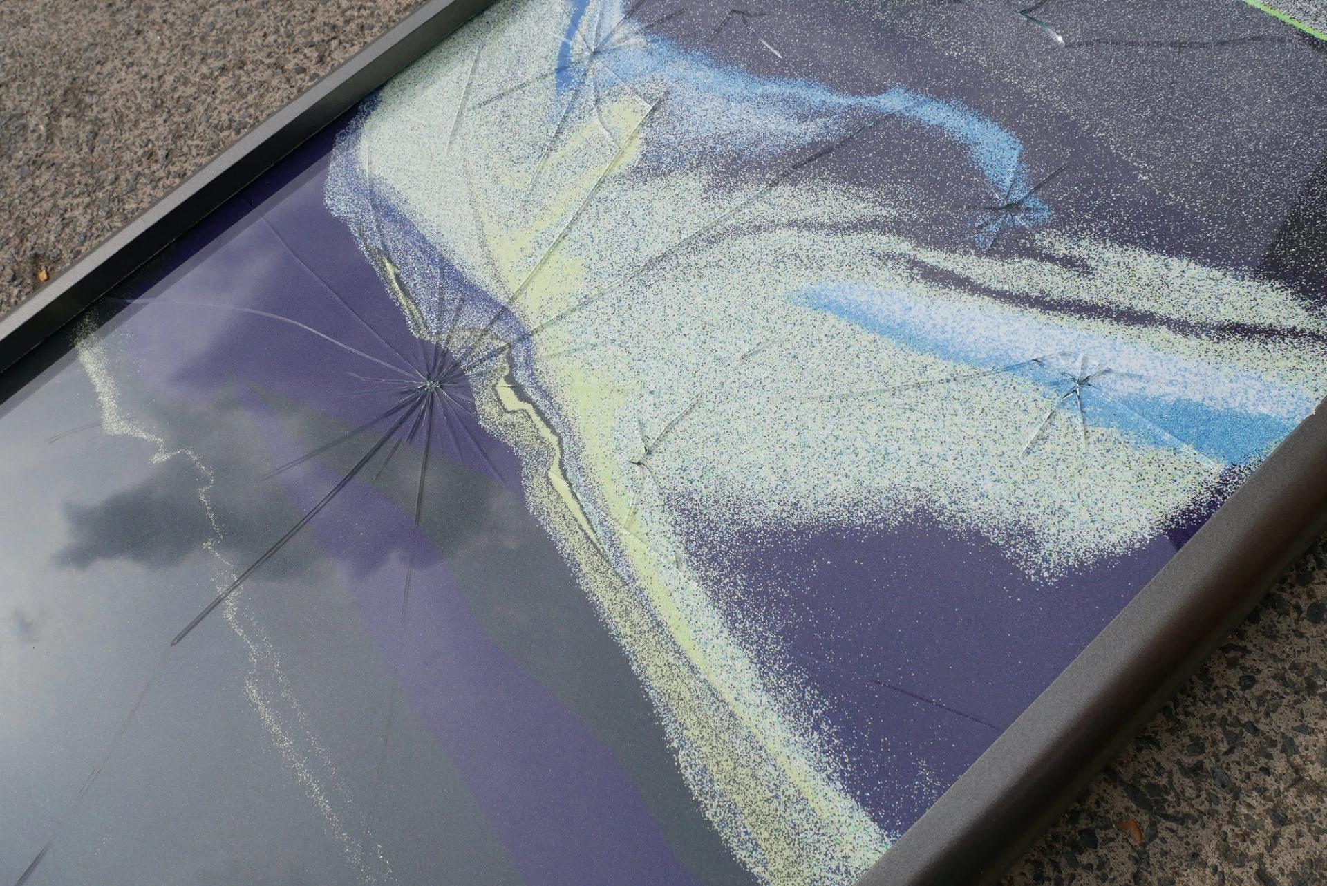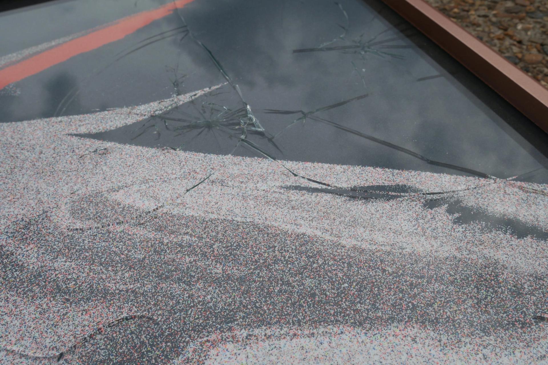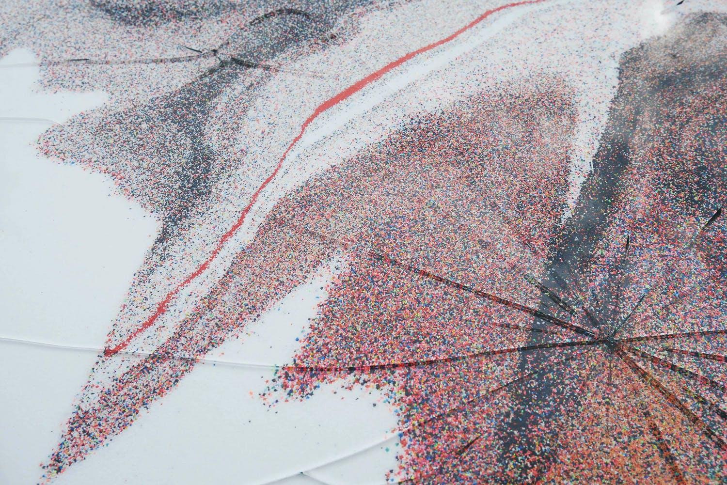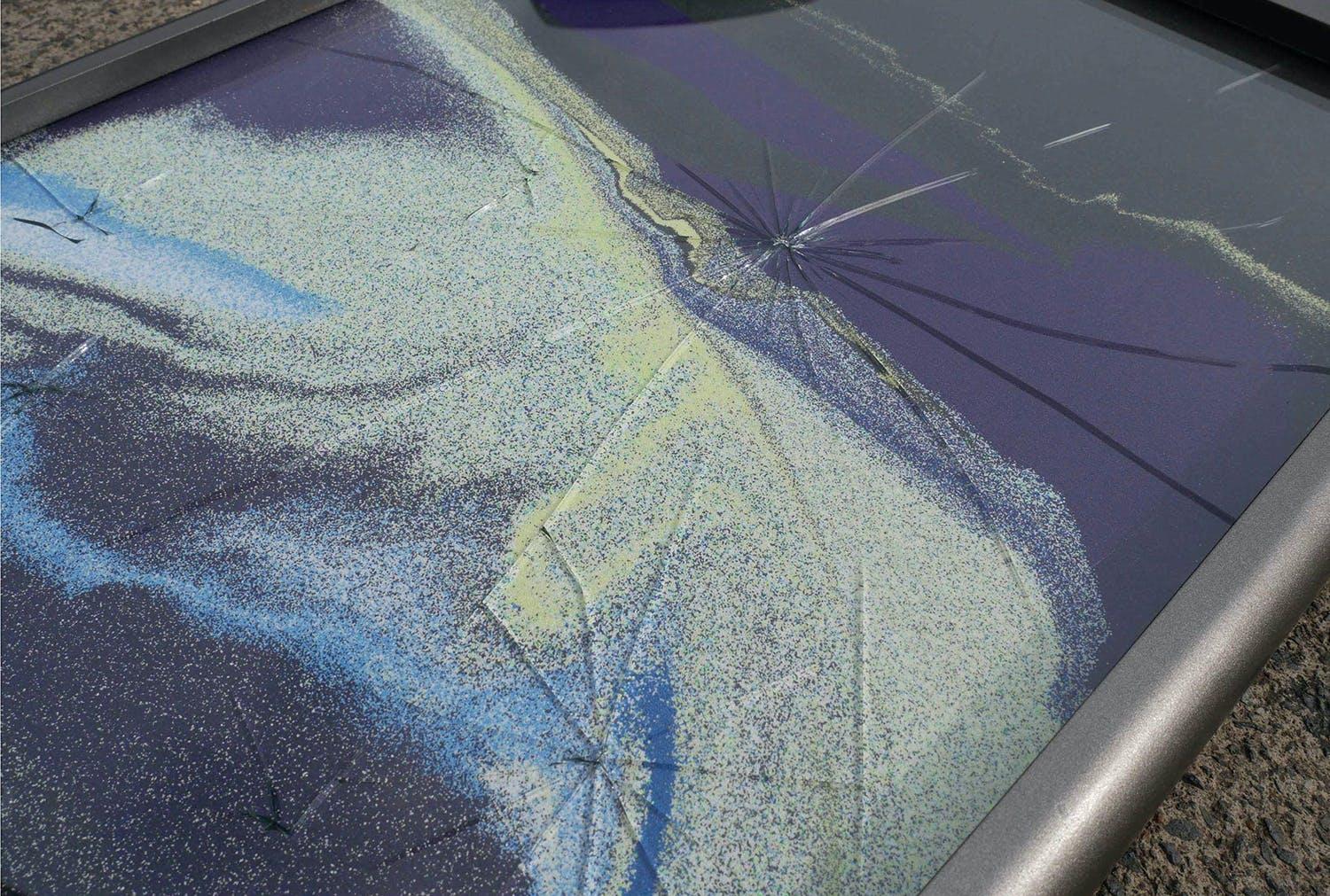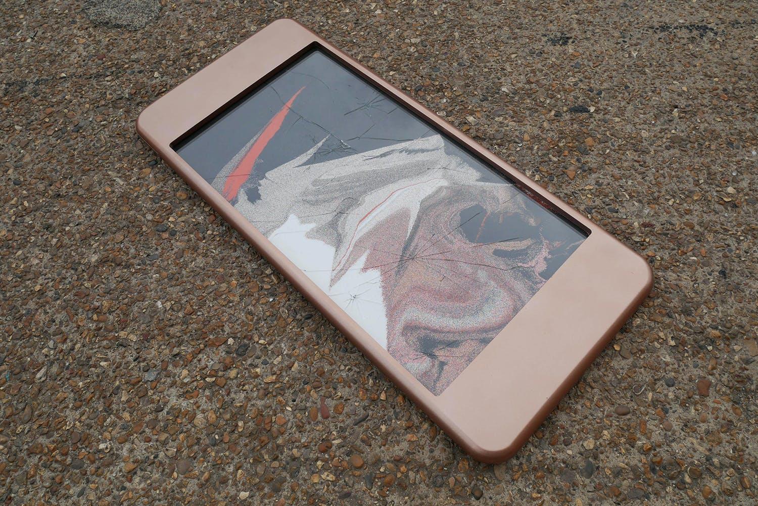 In KMN (kill me now) & FML (fuck my life) the patternation of the broken screens are inspired by Arabic sand art, with a desire to explore the patterns achievable through the random and frenetic arrangement of coloured sand within a transparent vessel, in this case a handmade Iphone 6 replica at 6.66 times the scale. The charger cable OMG (oh my god) is the same scale, though in real life coming across these things causes very different feelings -the former, anxiety, the latter pure elation.