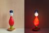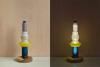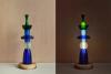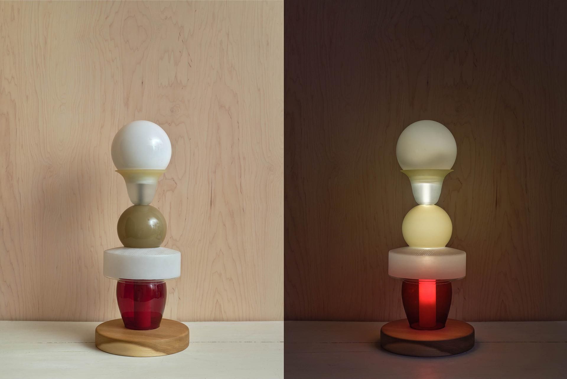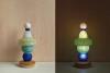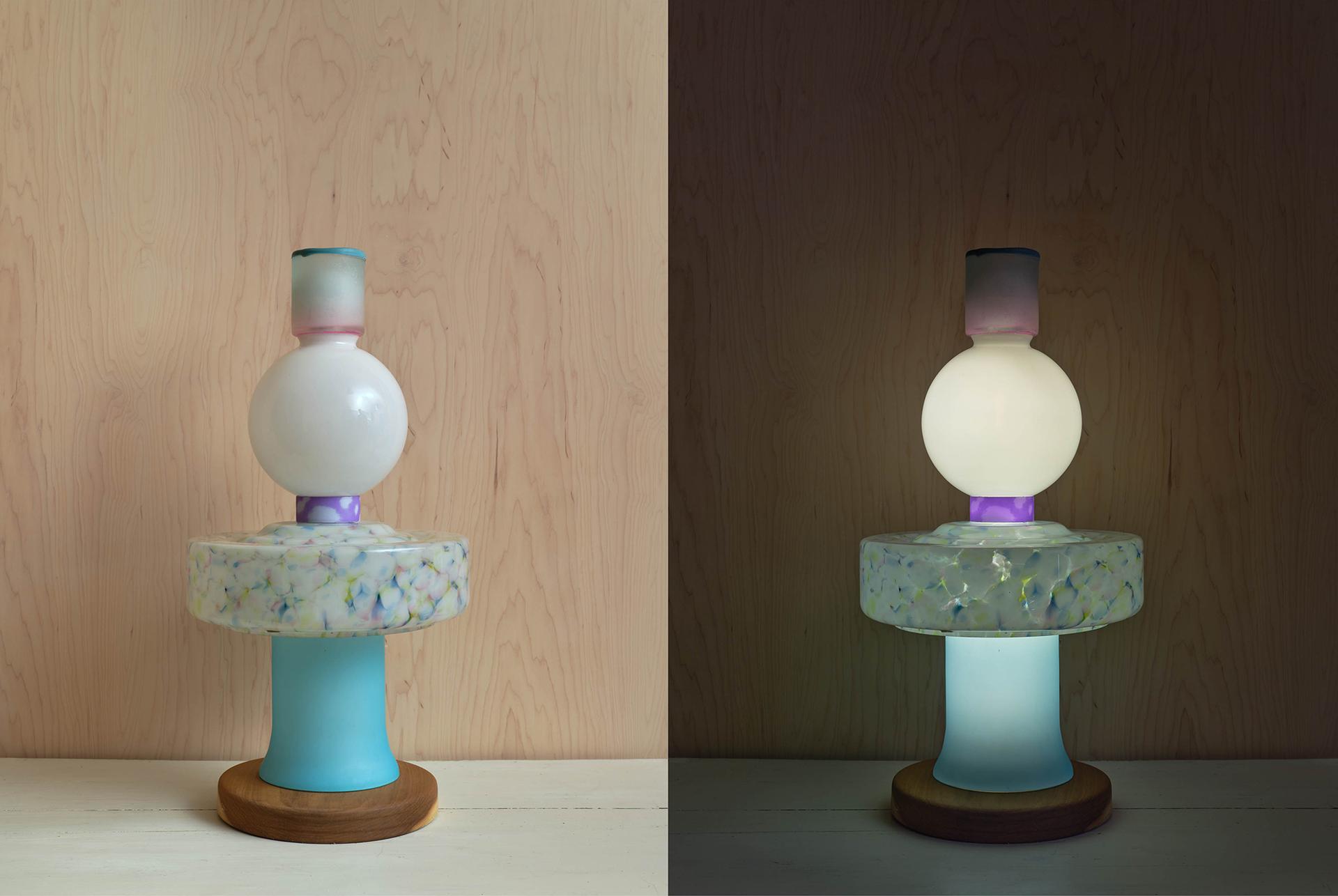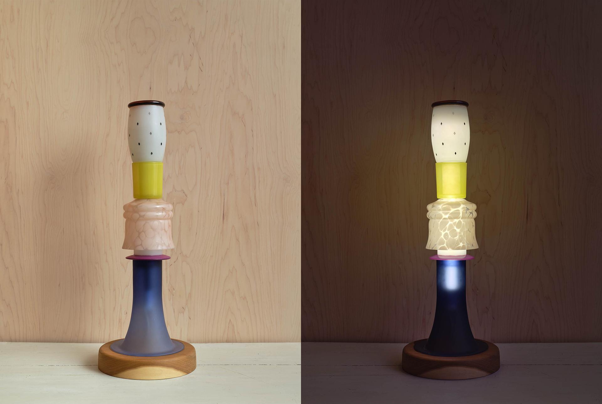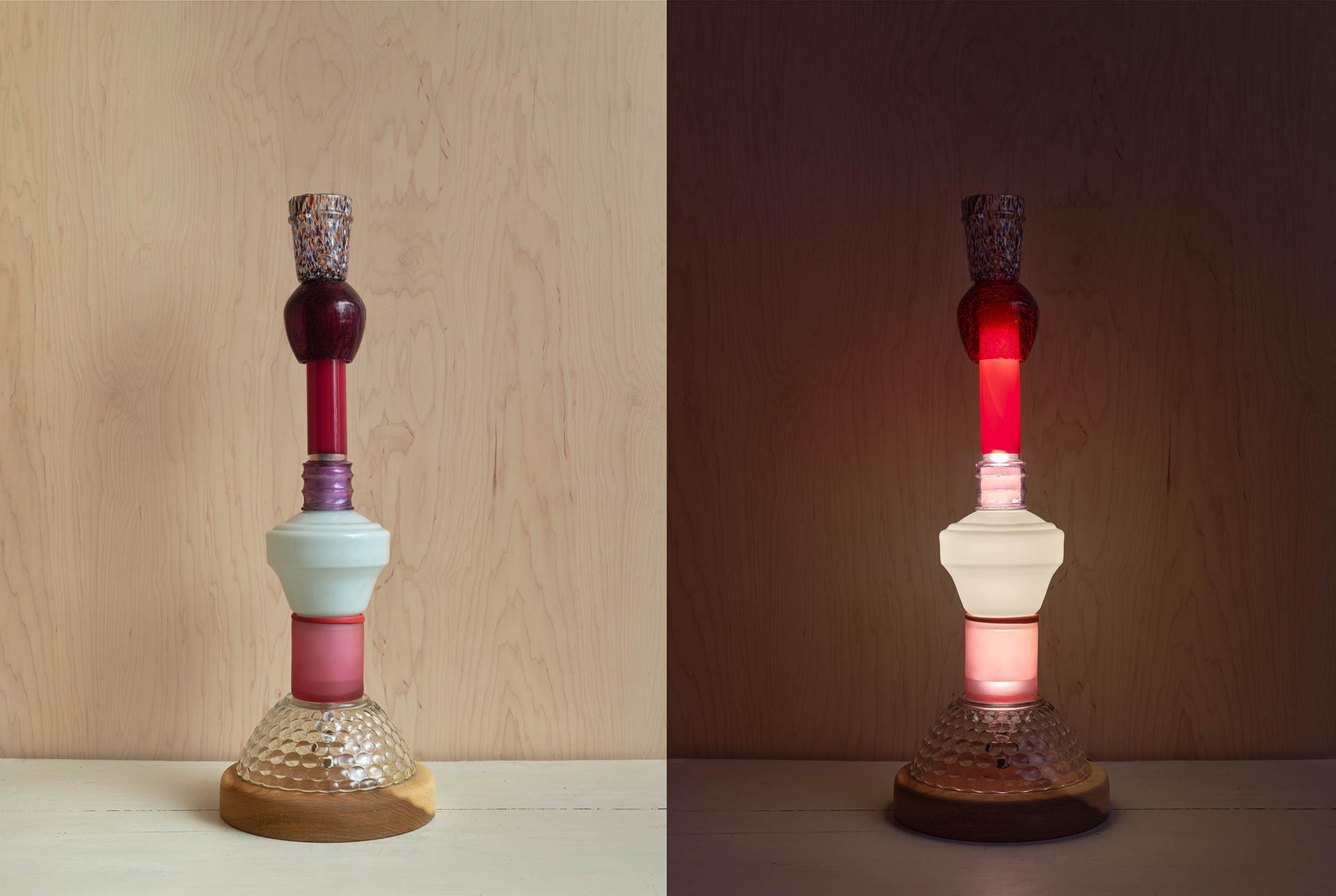 Vintage and modern glass items are colllected, some are then hand painted before being arranged over a glowing core, all sitting on a hand turned wooden base with a 3 metre black fabric power cord.