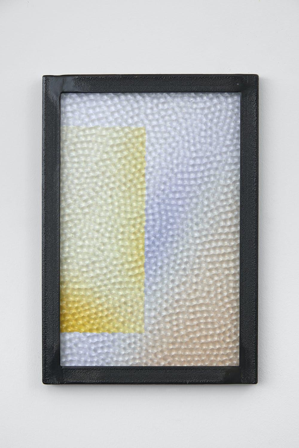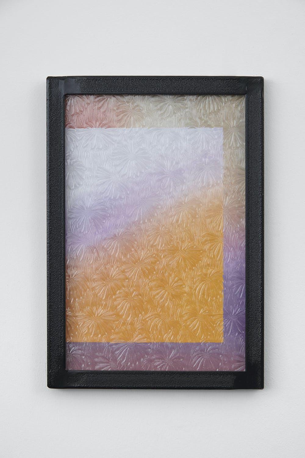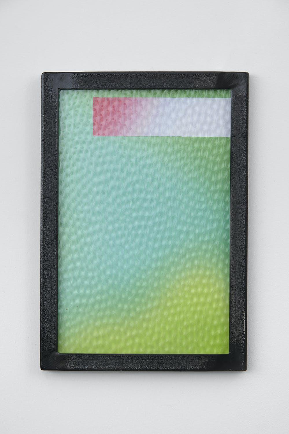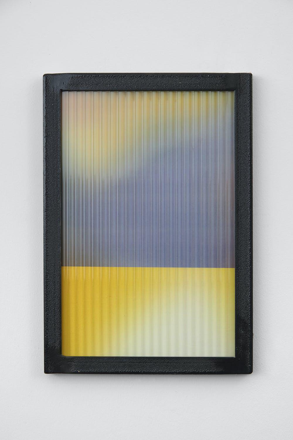 In the screen-time series, transient colour blurs from the camera accidentally shown on screen are captured by screen-shots. From this bank of imagery, two are selected and collaged in the ratio of screen-time and non screen-time for a specific day. Textures are added through the use of industrial privacy glass.
