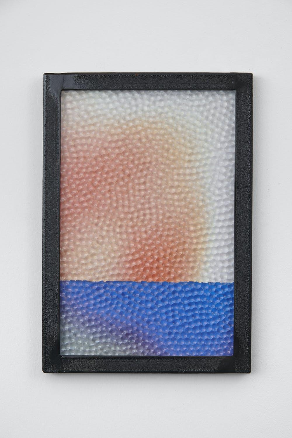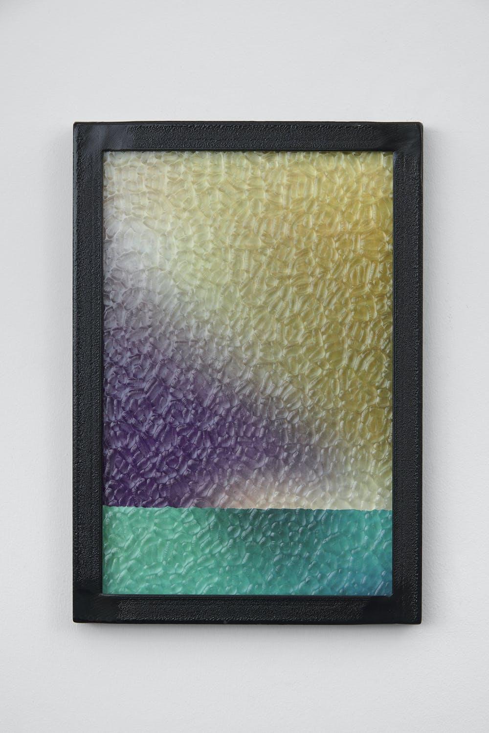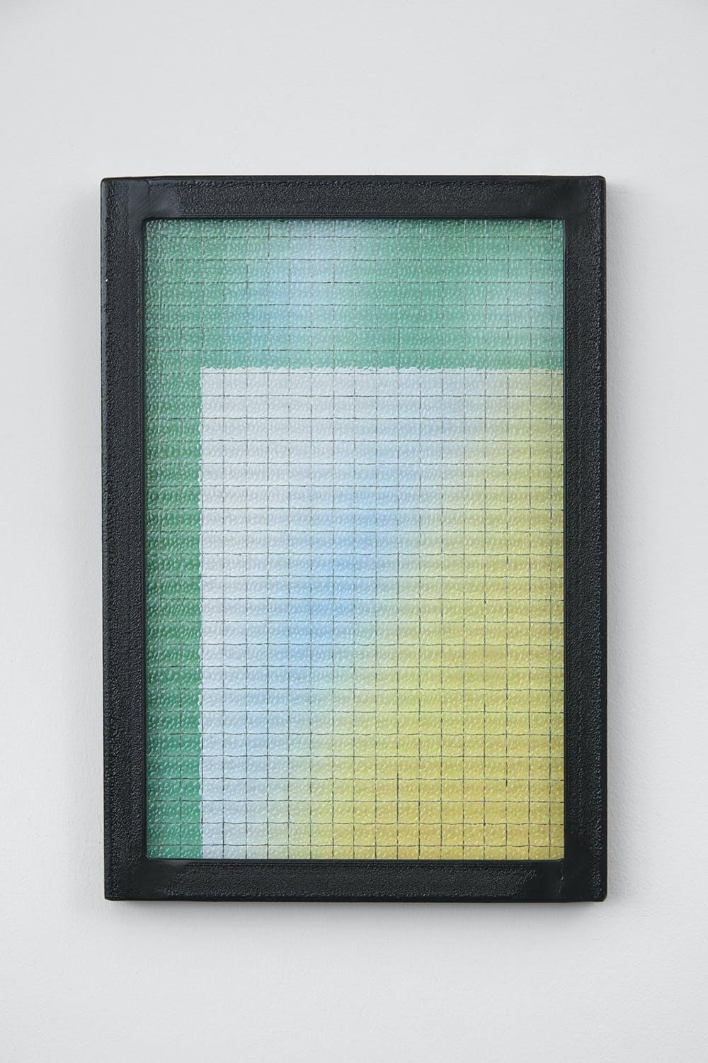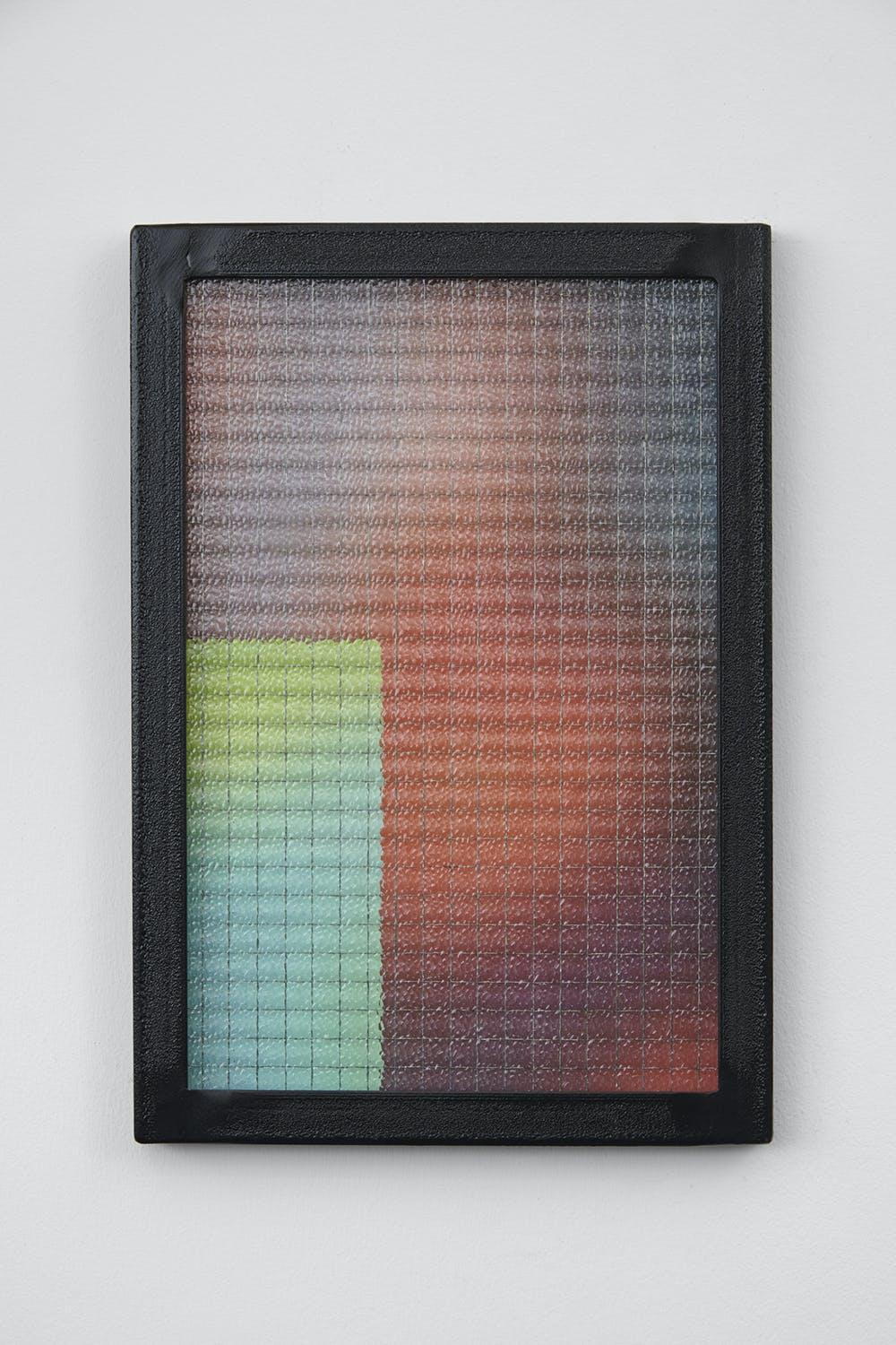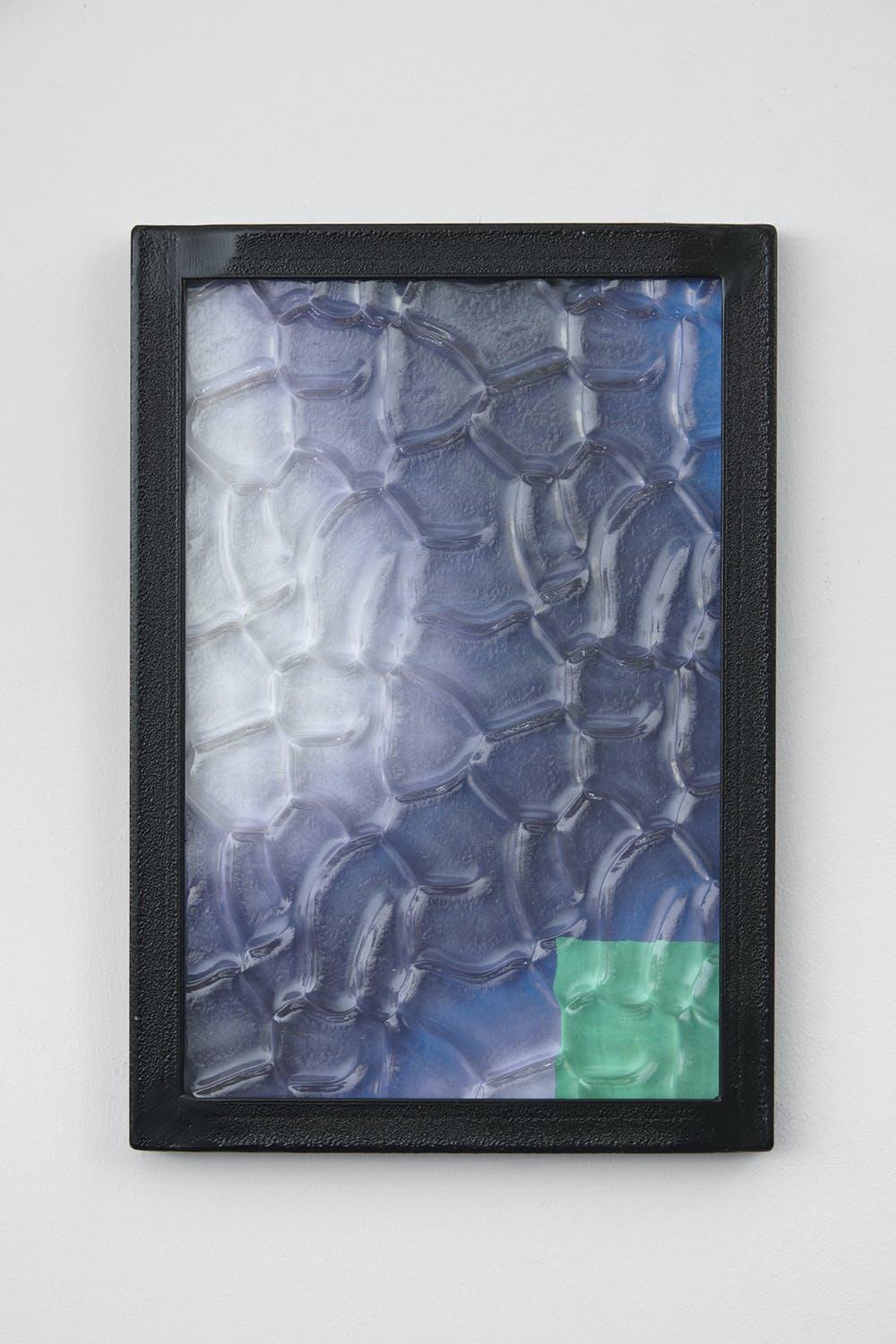 In the screen-time series, transient colour blurs from the camera accidentally shown on screen are captured by screen-shots. From this bank of imagery, two are selected and collaged in the ratio of screen-time and non screen-time for a specific day. Textures are added through the use of industrial privacy glass.